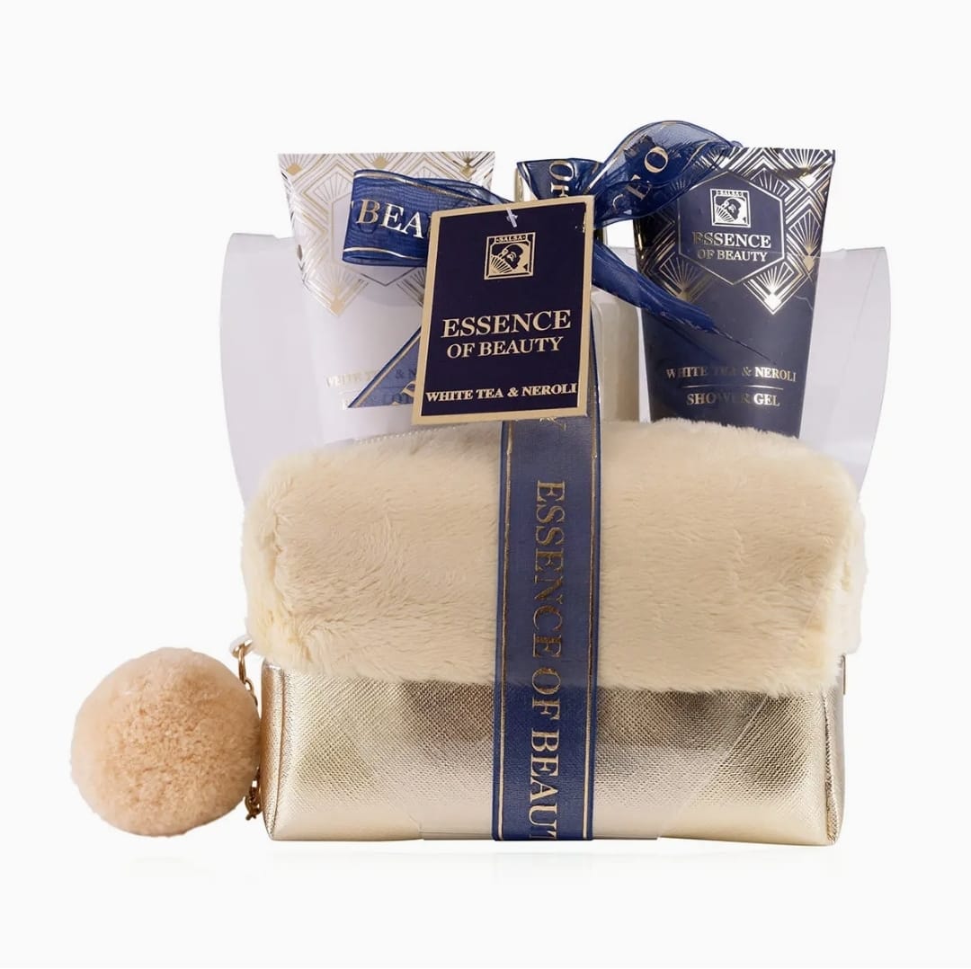 Ensemble de bain composé de: bain moussant 100ml, lait corporel 80ml, gel douche 80ml, trousse de toilette dorée et fausse fourrure. Parfum thé blanc et néroli