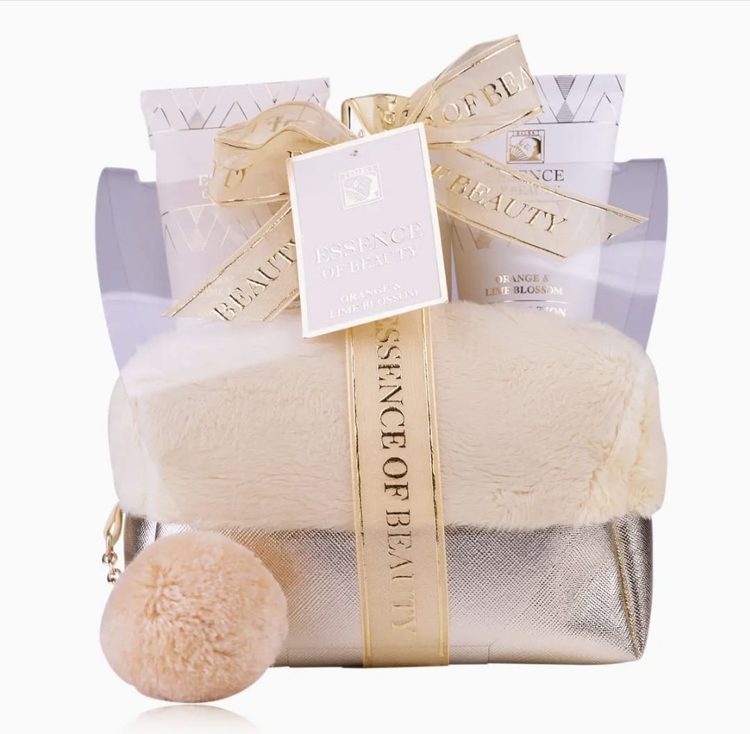 Ensemble de bain composé de: bain moussant 100ml, lait corporel 80ml, gel douche 80ml, trousse de toilette dorée et fausse fourrure. Parfum fleur d'oranger et fleur de tilleul